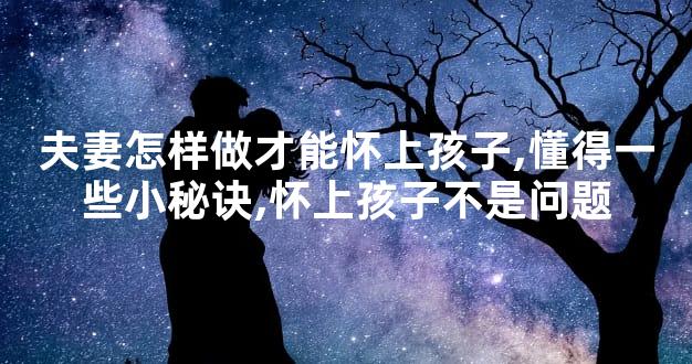 夫妻怎样做才能怀上孩子?其中的学问可不少。生活方式要健康,要算准时间等等,做好这些,就可以静待孩子的来临了。在整个备孕期间,不需要太过紧张焦虑,不要总是想着你要生孩子。越想,压力越大,怀孕的几率也会越小。往往会造成希望越大失望越大的情况。放平心态是关键。